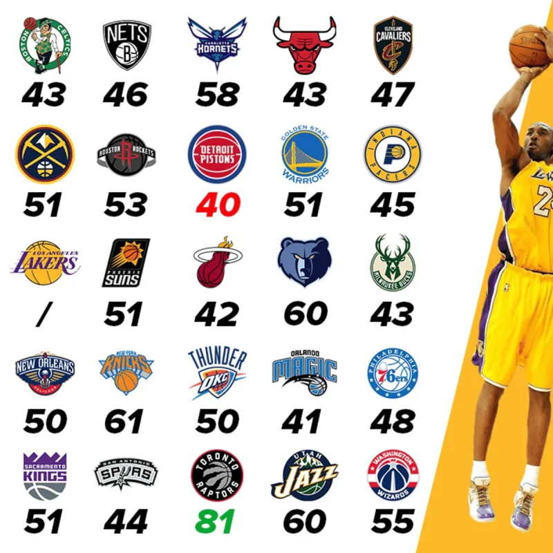 图中,科比生涯最高分为面对猛龙的81分,面对4支球队砍下过60+得分,最高分中最低也有40分。